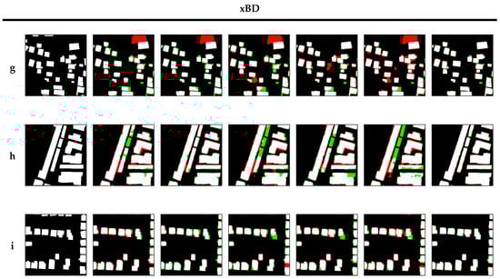 In our experiments, the original images were cropped into non-overlapping 256 × 256 sections and then randomly allocated to training, validation, and test sets in a ratio of 7:2:1 for experimentation. Notably, the xBD dataset classifies change areas into four damage levels: no damage, minor damage, major damage, and destroyed. As our focus lies solely in change areas, we treated the latter three classes as change during experimentation. The models were trained from scratch for 30 epochs, using an initial learning rate of 0.001 and a batch size of 16. The learning rate decreased by 10% every 5 iterations after the initial 15 iterations. The hyperparameters for spatial feature exchange and channel feature exchange were set to 0.5. To ensure an equitable performance comparison, the loss functions of all the comparative methods were replaced with the proposed model’s loss function, neutralizing performance discrepancies due to varied loss functions.
