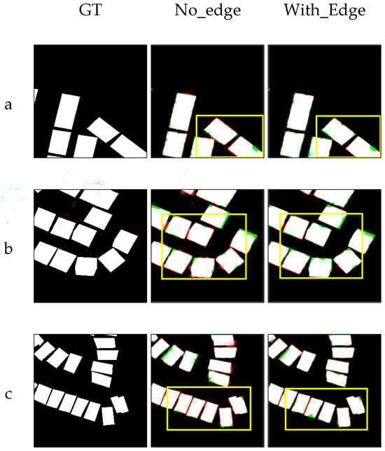 Comparison among qualitative results highlighting the contribution of the edge constraint module, including TP (white), TN (black), FP (red), and FN (green).