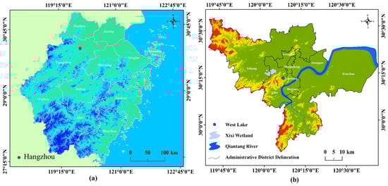 This study focuses on the water bodies within the main urban area of the city of Hangzhou. Hangzhou, the capital of Zhejiang Province, is situated in the alluvial plain of the Yangtze River Delta in eastern China and is geographically positioned between 29°11′–30°33′N and 118°21′–120°30′E. The city features an intricate network of slender rivers and a variety of lakes, ponds, springs, and reservoirs of various sizes and shapes, forming an extensive plain water system spanning in all directions and accounting for approximately 8% of the city’s total area. As a historically significant city renowned for its rich water culture, Hangzhou has notable water bodies, including the oldest canal system in China, the picturesque West Lake, and Xixi Wetland Reserve [,]. In addition, the Qiantang River flows around the city in the northeast and connects with the trumpet-shaped Hangzhou Bay. With the world-famous QianTang Tide, saline water intrusion has endangered the safety and quality of drinking water for a long time. Hangzhou has expanded rapidly in recent decades, resulting in significant changes in land use patterns. The increasing demand for land has led to a reduction in the water area, thereby greatly affecting the distribution characteristics of surface water [,,]. A map of eastern China and the latest administrative division map of Hangzhou are shown in Figure 1.