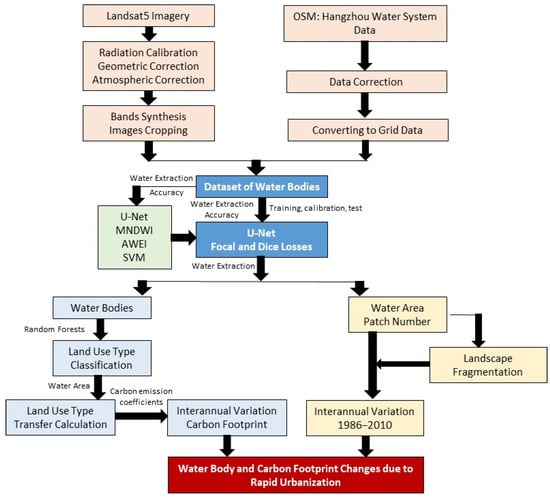 Figure 2 illustrates the fundamental technical workflow of this study. First, the selected Landsat5/TM images from 1985–2010 and OSM data were pre-processed to generate a dataset of water bodies for training the U-net convolutional neural network (U-Net) deep learning model. The proposed method underwent a series of accuracy evaluations and model optimizations. Second, the trained U-Net model was compared with traditional water body extraction models, including the modified normalized difference water index (MNDWI), automated water body extraction index (AWEI), and SVM. The advantages of U-Net deep learning technology in this context were assessed. Third, the trained U-Net model was used to extract water bodies from the main urban area of Hangzhou from 1986 to 2010, enabling a comprehensive analysis of interannual changes in area, patch number, and landscape fragmentation. The main stimulation inducing the changes in the water area was identified. Meanwhile, the RF method was employed to classify land use within the main urban area of Hangzhou, facilitating an assessment of variations in carbon footprint under rapid urbanization over a distinct period.