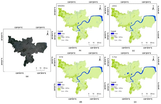 Comparison of water body extraction results by different methods: (a) the original Land-sat5/Thematic Mapper image acquired in 2010; (b) modified normalized difference water index; (c) automated water body extraction index; (d) SVM; and (e) U-Net.