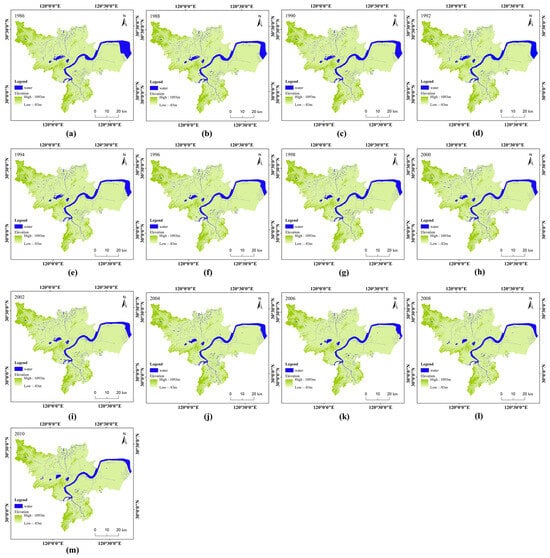 The water bodies in the main urban area of Hangzhou have exhibited minimal changes year by year. To better identify significant changes in water bodies and to avoid the minimal influence of seasonal climate and variations in precipitation on the extraction results, the trained U-Net model was employed to extract water bodies from pre-processed Landsat 5/TM imagery every 2 years. A total of 13 extraction results were obtained and are shown in Figure 6. The general distribution pattern of water bodies in the main urban area of Hangzhou has remained relatively stable over the past 25 years. The prominent features include the Qiantang River, West Lake, Xixi Wetland, the Great Canal network, and numerous scattered small water bodies.