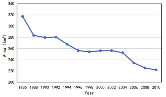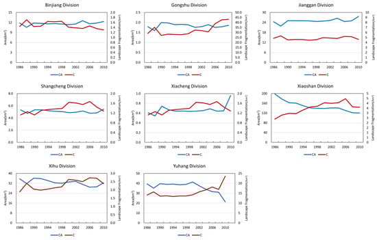 It is noteworthy that the fragmentation index of Yuhang and Xiaoshan Divisions increased, indicating the particularly profound impact of rapid urbanization on the edge of the city. It should be noted that the water area in Xiaoshan Division showed an obvious decline, although it had the largest water area among the eight divisions in Hangzhou. The water area decreased from 198.39 km2 in 1986 to 120.10 km2 in 2010, while the fragmentation index continuously increased, which indicated the loss of large water bodies during the rapid development. Meanwhile, the water area of Yuhang Division decreased significantly along with its urbanization development, particularly after 2000. The water area decreased by about 45% in 2010 with a distinct increase in fragmentation index.