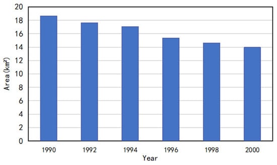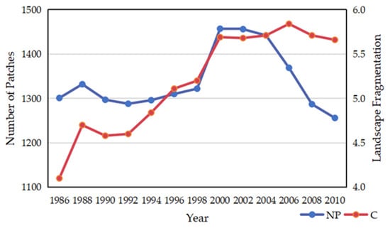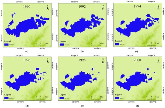 Fragstats software (University of Massachusetts, Massachusetts, USA, Version 4.2.1) was used to calculate the number of water body patches every 2 years, combined with the total patch area (CA, km2) and the landscape fragmentation index (C, in 1/km2) (Table 4).
