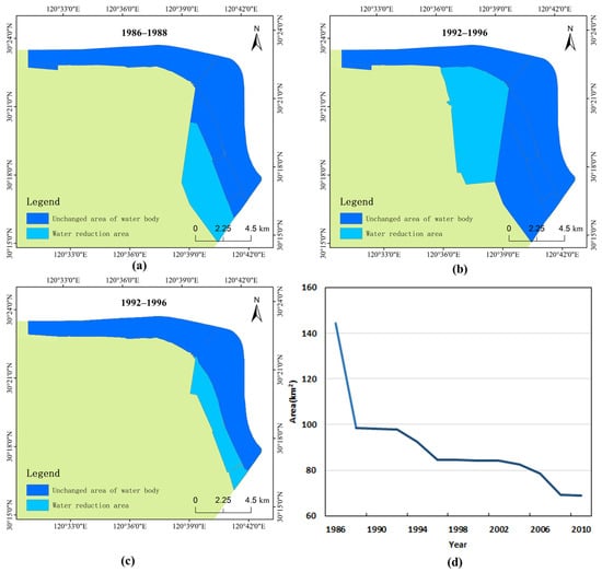As shown in Table 6, the conversion area between water bodies and cultivated land was the largest, exceeding 90% during the periods 1985–1990 and 2005–2010. This conversion mainly occurred on the eastern side of the Qiantang River, where most water bodies were transformed into cultivated land. This situation is quite similar to that on the southern bank of Hangzhou Bay []. Additionally, the water area in the eastern Xixi Wetland was primarily converted into construction land. The decrease in water bodies in these two regions significantly contributed to the changes in land use.