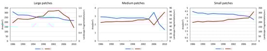 It is noted that the change trend of both the water area and patch number is different, corresponding to different sizes of water bodies from 1986 to 2010. The area of large patches continued to decline, but fragmentation increased continuously before 2004 and then began to decline. For patches of medium size, both the area and fragmentation changed slightly, but with a reverse tendency. However, there was a drastic decrease in fragmentation after 2004, followed by a rapid increase after 2006. Whereas the water area showed an inversely drastic change. It is noteworthy that both the area and fragmentation of the small patches basically showed stable and inverse variation; the obvious change was observed in 2008, resulting in an increase in fragmentation degree and a decrease in area.
