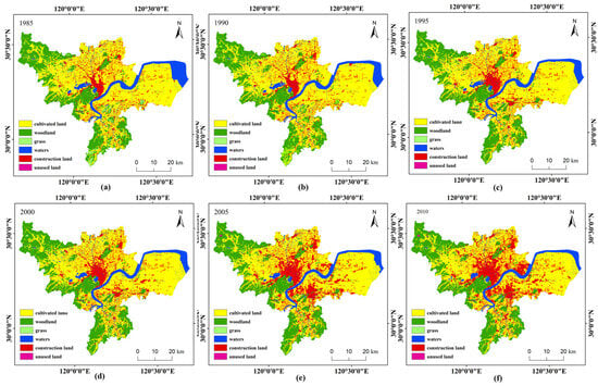 where N is the total number of pixels. The accuracy of the Kappa coefficient was 88%, indicating reliable classification. As shown in Figure 13, cultivated land covers the largest part of the main urban area of Hangzhou, while woodland is predominantly located in the peripheral areas. Grassland and unused land occupy a relatively small area, while the construction land is primarily concentrated along both sides of the Qiantang River, and its area has been expanding over time.