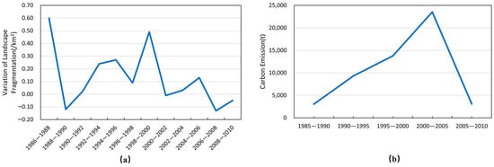 Biennial changes in (a) landscape fragmentation and (b) carbon footprint from 1985 to 2010.