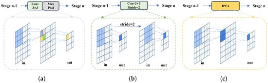 Comparison of receptive field and feature map size changes between IPFA and the modules used in different stages of the YOLO series. (a) YOLOv1 and YOLOv2. (b) YOLOv3 and later versions. (c) Our model.