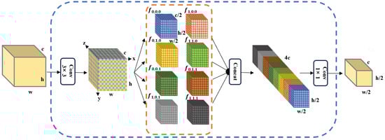 where W, H, and C refer to the maximum width, maximum height, and maximum number of channels of the input feature map, respectively. represent the eight sub-features obtained after splitting the input features. These sub-features are then recombined using the concat operation in the channel dimension. Finally, a 1 × 1 convolution is used to perform information interaction on the recombined features in the channel dimension with the following formula: