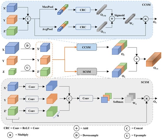 where refers to max pooling operations and refers to average pooling operations. represents two convolution operations with a ReLU activation in between, and ⊗ denotes element-wise multiplication. After concatenating the input features, they are separately passed through average pooling and max pooling operations to generate the corresponding weights and . These two weights are then summed along the spatial dimension and passed through a sigmoid activation function to generate channel-wise adaptive weights . Finally, is element-wise multiplied with the concatenated input features to obtain the output of CCSM, .