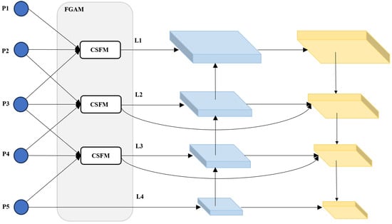 In deep learning neural networks, shallow feature maps have smaller receptive fields and more robust feature representation capabilities, making them suitable for detecting small objects. Conversely, deep feature maps are more suitable for detecting large objects. Multi-scale feature fusion combines the advantages of shallow and deep feature maps. It aims to combine feature maps from different scales or resolutions to obtain a more comprehensive and rich feature representation, thereby achieving better feature fusion effects. However, directly fusing information of different densities can lead to semantic conflicts, limiting the expression of multi-scale features. To address this problem, we propose FGAFPN, whose specific structure can be observed in Figure 6.
