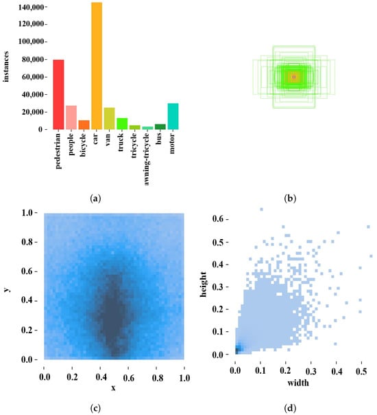 To assess the effectiveness of our proposed methods, we conducted experiments using the VisDrone2019 dataset []. The VisDrone2019 dataset is a collection of visible light images captured by drones, curated by the AISKYEYE team at the Lab of Machine Learning and Data Mining, Tianjin University. This benchmark dataset encompasses various altitudes, lighting conditions, and weather scenarios, featuring objects with diverse degrees of occlusion and deformation. Comprising 10,209 static images, the dataset’s resolutions range from 2000 × 1500 pixels to 480 × 360 pixels. It is partitioned into training, validation, and test sets, containing 6471, 548, and 3190 images, respectively. Figure 7 quantitatively illustrates some characteristics of the VisDrone2019 dataset. Figure 7a depicts the specific quantities of each category within the dataset. Figure 7c showcases the distribution of object bounding box center coordinates, with darker shades indicating a concentration of object centers in the middle to lower regions of the images. Figure 7b,d, respectively, present the size distribution of object bounding boxes and a scatter plot illustrating the correspondence between the widths and heights of these bounding boxes. These visualizations collectively indicate the prevalence of small objects and objects with significant scale variations within the dataset, thereby posing challenges for object detection tasks.