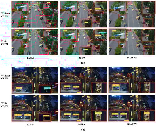 Through refined feature fusion, FGAFPN acquires detailed features and effectively uses contextual information, enabling a higher-level semantic understanding. Figure 9 intuitively demonstrates the effectiveness of FGAFPN through visualization. In images from the VisDrone2019 dataset, FGAFPN combined with CSFM can detect targets obscured by trees, buildings, and bridges, including small targets. This capability reduces false positives and false negatives to some extent. Other FPN methods utilizing CSFM also exhibit improved detection performance. Specifically, the BiFPN combined with CSFM can accurately detect targets obscured by obstacles such as trees and bridges, and the confidence of detected obscured targets is enhanced. This confirms the effectiveness of CSFM in enhancing multi-scale feature fusion.