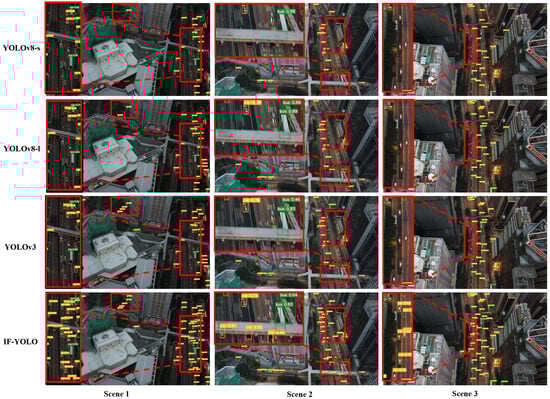 We also compared the performance of YOLOv8-l, YOLOv3, IF-YOLO, and the baseline model YOLOv8-s in images taken under different scenarios and lighting conditions. The results are shown in Figure 10. Our study revealed that IF-YOLO is the most accurate model for object detection under dim lighting conditions. We observed that YOLOv8-s and YOLOv8-l missed many detections in scene 1, only detecting a small portion of the targets. YOLOv3 also exhibited limited capability in detecting vehicle objects. However, IF-YOLO detected most of the targets, including those occluded by obstacles, making it more accurate than the other models. Scene 2 demonstrated that YOLOv8-s, YOLOv8-l, and YOLOv3 failed to detect vehicles obstructed by bridges. IF-YOLO exhibited a more pronounced advantage when detecting numerous small objects, as depicted in the comparison plots for the three scenes. YOLOv8-s, YOLOv8-l, and YOLOv3 displayed numerous missed detections within the red boxes in the images, whereas IF-YOLO detected almost all targets. Overall, these results suggest that in UAV image object detection tasks, IF-YOLO outperforms others in detecting small, occluded, and targets under poor lighting conditions, reducing false and missed detections.