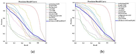In addition to the above-mentioned comparison, we plotted the confusion matrix between our model and the baseline, as depicted in Figure 11. The horizontal axis represents the true categories, while the vertical axis represents the predicted categories. Diagonal elements indicate the proportion of correctly predicted categories, while off-diagonal elements represent the proportion of mispredictions. It can be observed from the figure that the diagonal region in the right subplot is higher and darker than that in the left subplot, indicating an improvement in our model’s ability to predict object categories correctly. These conclusions are consistent with the P-R curve comparison, as shown in Figure 12. The area under the P-R curve (AUC-PR) for each class in our model is higher than that of YOLOv8-s, further demonstrating the superiority of our model.