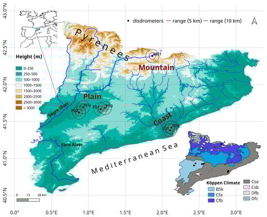 The locations of the disdrometers are representative of three key areas with different climatic and orographic characteristics typical of Catalonia: mountain (in the Pyrenees mountains), plain (inland plain of the Segre River Valley) and coast. The disdrometers of Tordera, Mollerussa, Tarrega and Cendrosa are in the plain subregion, characterized by flat terrain with few orographic contrasts and an arid Köppen climate (Figure 1), conditioned by precipitation deficit. Disdrometers located at the Faculty of Physics and Fabra Observatory represent the coast subregion with a hot-summer Mediterranean Köppen climate, more exposed to Mediterranean heavy precipitation. The disdrometer at Das was in a valley at 1094 m a.s.l. in the mountain subregion and had a temperate Köppen climate.