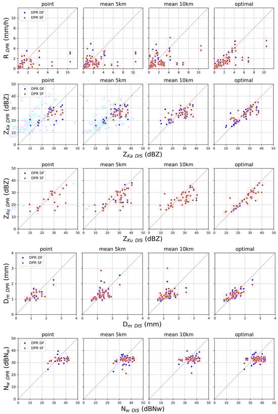 - Optimal: Disdrometer data were compared with the DPR pixel closest to the disdrometer within a 5 km radius and the nine DPR pixels containing the disdrometer. Finally, among these nine pixels, the pixel with closest radar reflectivity factor to that of the disdrometer was selected for comparison.