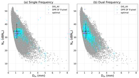 Dm vs. Nw for all available disdrometer data (grey dots), GPM data of nine pixels around the disdrometers (cyan dots) and GPM data coincident with disdrometers (violet dots) under optimal method showing GPM single-frequency (a)- and dual-frequency (b)-derived estimates. The black and red dots with the error bars represent the averages and standard deviations of the disdrometer dataset and GPM 9 pixels method.