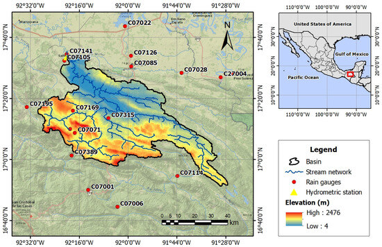 The research focused on the Tulijá River Basin (TRB) up to the Salto de Agua hydrometric station in Chiapas, Mexico (CONAGUA code: 30042). The TRB drains an area of 3560.91 km2 and it is located in the Grijalva–Usumacinta Hydrological Region (RH30) between parallels 16°40′N to 17°40′N and meridians 91°28′W to 92°32′W (Figure 1). The warm, humid climate predominates in most of the TRB, with a rainfall regime throughout the year. In the high mountains of the basin, at 1500 m a.s.l, the climate is semi-warm, and the most abundant rains occur there, with an average annual precipitation of 2500 to 4000 mm. However, in areas where the elevation is greater than 2000 m a.s.l, rainfall reaches more than 4000 mm per year. The rest of the basin usually has an annual rainfall between 1500 to 2000 mm. From May to October, precipitation ranges between 1500 mm and 2600 mm, while from November to April, precipitation ranges from 350 mm to 1400 mm.