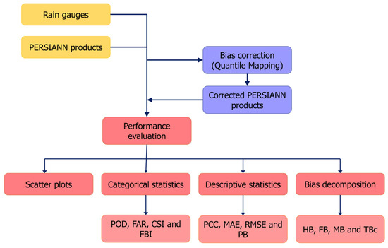 For the evaluation of satellite-based precipitation products (SPP), the following data analysis techniques were employed: (a) scatter plots, (b) categorical statistics, (c) descriptive statistics, (d) bias decomposition, and (e) bias correction using the quantile mapping method (Figure 2). Data analysis was conducted by comparing the recorded precipitation from each rain gauge against its respective SPP pixel match (Figure 3). A rain gauge-to-pixel analysis was performed to compare the precipitation data from the rain gauges with the corresponding SPP pixel. Therefore, estimates of 17 pixels of the SPPs that coincide with the location of the rain gauges were selected.