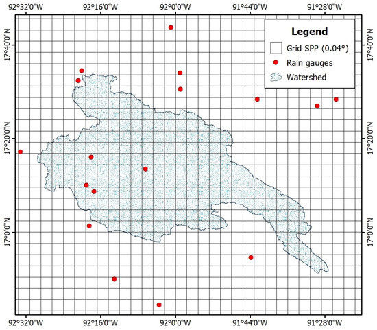 Spatial distribution of the rain gauges and spatial resolution of the SPP (0.04°).