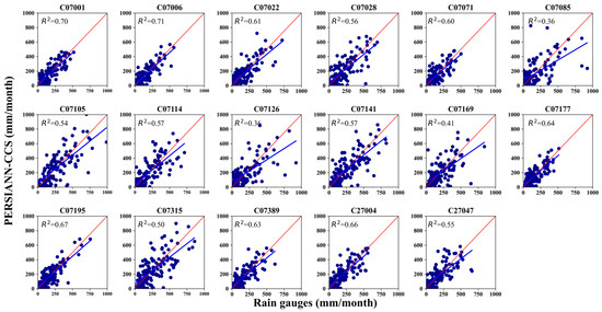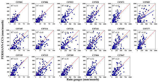 Scatter plots comparing monthly rainfall from rain gauges to the respective PERSIANN-CCS reference pixel.