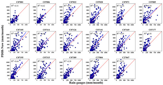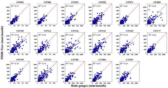 Scatter plots comparing monthly rainfall from rain gauges to the respective PDIR-Now reference pixel.