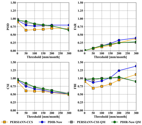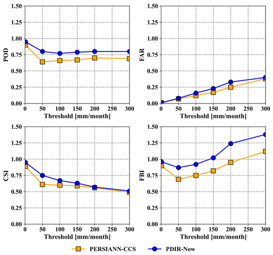 Regarding CSI, in the PDIR-Now product, the score is slightly higher, but overall, both PERSIANN-CCS and PDIR-Now showed better results at thresholds below 100 mm/month, while at thresholds above this, the score deviates from the ideal score (one). Regarding FBI, both products exhibit both underestimation and overestimation events. For PDIR-Now, overestimation is more noticeable, occurring at thresholds above 150 mm/month, while for PERSIANN-CCS, it occurs exclusively at the largest threshold (300 mm/month).