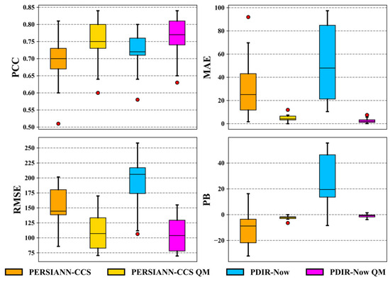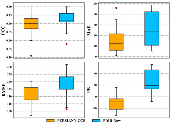 Box and whisker plot of the descriptive statistics of both SPPs (PERSIANN-CCS and PDIR-Now).