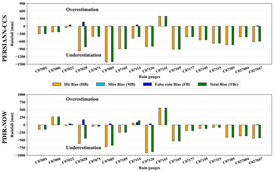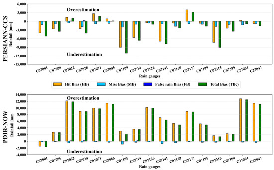 For a quantitative and continuous analysis of the performance of the SPPs for the entire, complete sample (2004–2014), the total bias was decomposed into hit biases (HB), miss biases (MB), and false biases (FB). Figure 8 presents the various biases of the two SPPs (PERSIANN-CCS and PDIR-Now) as the total amount of rainfall over the eleven-year study period. A quick inspection of Figure 8 shows that the PDIR-Now biases are higher.