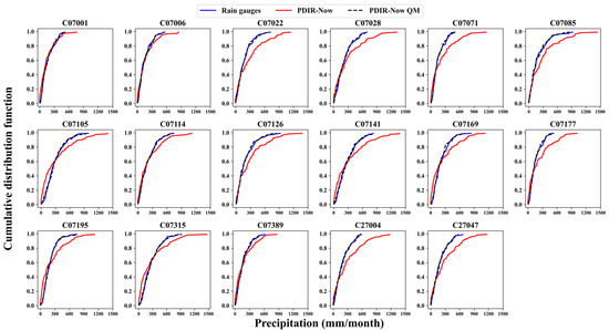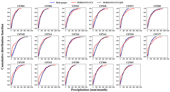Bias correction was performed using the quantile mapping (QM) method. The QM method was applied monthly to the SPPs (PERSIANN-CCS and PDIR-Now) to reduce systematic error over the Tulijá River Basin. Cumulative distribution functions (CDF) calculation was based on the two-parameter gamma function. Figure 9 and Figure 10 show the CDFs before and after the bias correction of the SPPs (PERSIANN-CCS and PDIR-Now) corresponding to the reference rain gauge for the entire study period. They also display the corrected estimates of satellite products using the QM method. The two-parameter gamma distribution function fits the rainfall records.