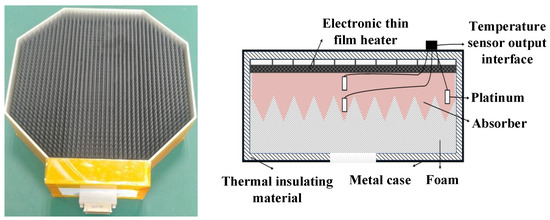 For the flight calibration scheme, the low-temperature calibration load uses an ambient load with the same ambient temperature, which is about 220 K at an altitude of 12,000 m. The high-temperature calibration load uses a standard radiation black load (Figure 5) with a radiation brightness temperature heated to about 330 K. The warm load is a microwave-absorbing material with a pyramidal structure, and the control of physical temperature is realized by an electronic thin film heater. In order to improve the accuracy of physical temperature measurement, a set of platinum resistance thermometers (PRTs) was mounted in the warm load. Several platinum resistors are placed in the center tip bottom, center tip top, edge tip bottom, edge tip top, and other positions of the tip split within the warm load, and the physical temperature of the warm load is calculated based on the actual measured values of these temperature measurement points and the thermal conductivity and temperature gradient of the warm load. The stability of the warm load is less than 0.15 K and the accuracy of the warm load temperature is less than 0.1 K. The load emissivity is 0.999.