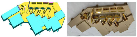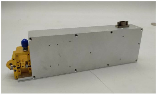 The aperture of the reflector is 250 mm, and the antenna reflector, scanning mechanism, quasi-optical feed network, and receiver are laid out in the combined form of Figure 4. The height of the reflector center from the base plate is about 248 mm, and the height of the mounting plate of the quasi-optical feed network and receiver from the base plate is about 183 mm. The size of the calibration controller is 248 mm × 204 mm × 45 mm, and the size of the acquisition control and distribution unit envelope is 420 mm × 482 mm × 177 mm. Instruments are contained in a single package with dimensions of approximately 1.0 m × 0.55 m × 0.4 m and a weight of around 60.6 kg, Power consumption is 495 W (Figure 4). Fans are added on both sides of the reflector to prevent frosting and water vapor condensation during the flight through the clouds.