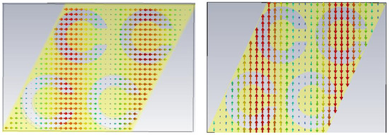 For the “C” structure frequency selection surface, the electric field direction of the TE wave (V polarization) is perpendicular to the short side of “C”, and the electric field direction of the TM wave (H polarization) is parallel to the short side of “C”. The simulation schematic is shown in Figure 9. The characteristics of each frequency selection surface are summarized in Table 5.