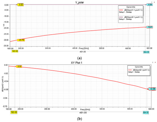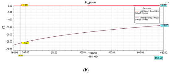 From the simulation results, the transmittance transmission loss of the polarized grid network to the vertical polarized wave is less than 0.1 dB in the whole operating frequency band. The frequency characteristics of the parallel polarized wave are shown in Figure 13.
