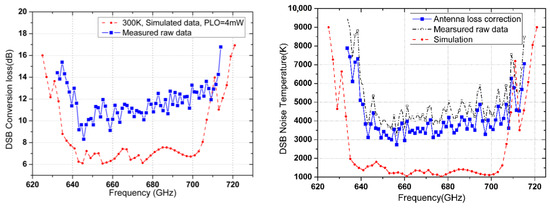 Based on the test results of the 664 GHz harmonic mixer, it was found that the 0.67 THz harmonic mixer has a minimum noise temperature of 3293 K at an RF frequency of 656.4 GHz, and a double-band frequency conversion loss of −11.3 dB. At the same time, the response range of the 0.67 THz mixer is 640 GHz~710 GHz, which is greater than 70 GHz. The double-band noise temperature is between 3200 and 7000 K, and the double-band frequency conversion loss is 10–14 dB.