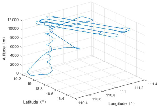 To verify the performance of ATICI, a series of ATICI airborne experiments were conducted in Boao, Hainan Province, China, in August and September 2023. The locations and times of the campaigns were chosen to maximize the opportunities to fly above cirrus clouds. In this section, the in-flight performance of ATICI is assessed by comparing high-altitude Earth observation views in clear skies with radiative transfer simulations. The ATICI is installed on the bottom of a Cessna 550 aircraft, as shown in Figure 25. A total of three flight observations were made, each of which lasted for three hours. The flight altitude was 12 km. The flight area was near the Xisha Islands in the South China Sea. The flight route is shown in Figure 26. The airborne experiments were performed in sunny weather and cloudy weather. The cloud cover was 50–70%, with scattered weak convection, and the height of high-level clouds was 10–12 km.