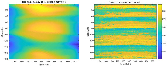 The input data for the simulation is CMA-MESO (China Meteorological Administration Mesoscale Numerical Forecasting), and the radiation transfer model uses the RTTOV model to simulate the observed brightness temperature during computer-based flight. Considering the impact of aircraft vibration on the observation angle during airborne flight, point data below the aircraft was selected for comparison between the simulated and observed brightness temperature. Taking channel 325.15 ± 3.5 V GHz as an example, the fluctuation trend of the observed brightness temperature was basically consistent with that of the simulated brightness temperature. As shown in Figure 27 and Figure 28.