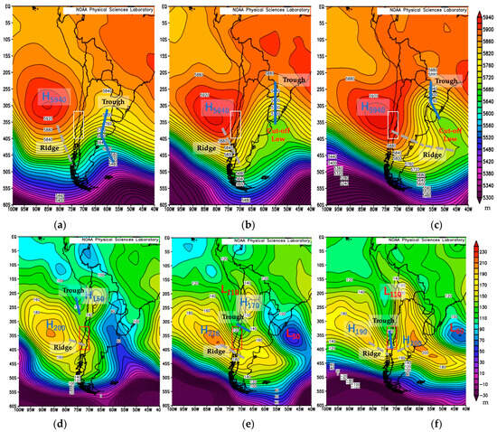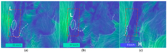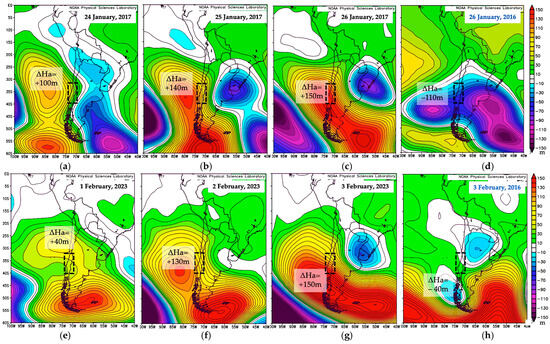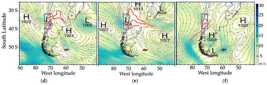 - Low-pressure systems of L110 in Figure 7e,f may cause strong wind conditions in the study area due to large height differences between L110 and H190 in the southeast Pacific Ocean.
