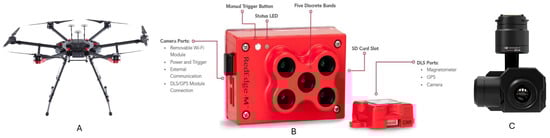 UAS platform and sensors for acquiring multispectral and thermal images: (A) DJI Matrice 600 Pro UAS platform; (B) MicaSense RedEdge multispectral sensor; (C) DJI Zenmuse XT Radiometric thermal sensor.