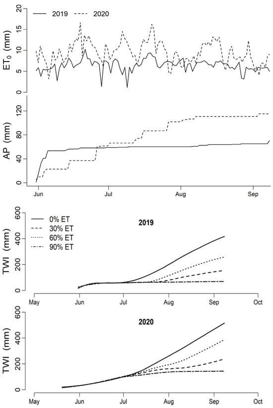 The daily reference evapotranspiration (ET0), accumulated precipitation (AP), and total water input (TWI), including irrigation and precipitation for each treatment during the growing seasons of 2019 and 2020, are shown in Figure 2. The accumulated ET0, from planting to the termination of irrigation, was 646 mm for the 2019 season and 1064 mm for the 2020 season. The accumulated precipitation for the same period was 70 mm for 2019 and 115 mm for 2020. In addition, the precipitation patterns were substantially different between these two seasons. In the 2019 season, precipitation was abundant (53.4 mm) from planting (31 May) to early summer (before 10 June), negligible (6 mm) during the second half of the summer (11 June to 6 September), and normal after the irrigation treatments (8 September). However, in 2020, precipitation was fairly regular through June (43.4 mm) and July (40.1 mm), but negligible in August (4.3 mm) and normal in September. The higher level of ET requirement in 2020 than in 2019 led to a greater irrigation amount. The total irrigation increased by 41%, 44%, and 19% for the 30%, 60%, and 90% ET treatments, respectively.