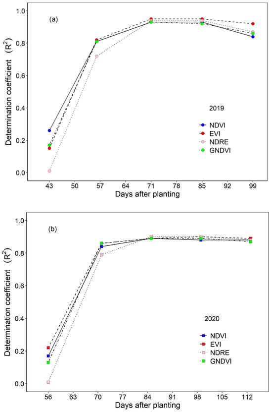 Relationship between cotton yield and VIs derived from UAS images. (a) Trends in R2 values for cotton yield correlations with NDVI, EVI, NDRE, and GNDVI in the 2019 season. (b) Trends in R2 values for cotton yield correlations with NDVI, EVI, NDRE, and GNDVI in the 2020 season.