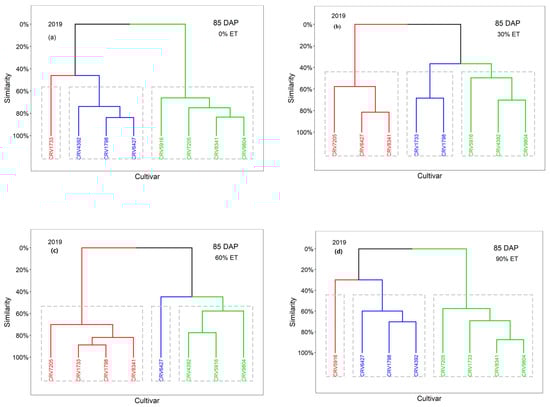 Hierarchical cluster analysis of cultivars under different irrigation rates ((a): 0% ET, (b): 30% ET, (c): 60% ET, (d): 90% ET) at 85 DAP in 2019 (DAP: days after planting).