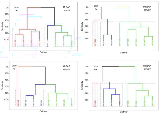 Hierarchical cluster analysis of cultivars under different irrigation rates ((a): 0% ET, (b): 30% ET, (c): 60% ET, (d): 90% ET) at 99 DAP in 2020 (DAP: days after planting).