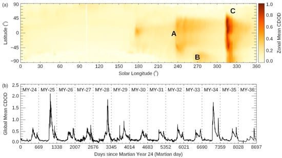 Variation of absorption column dust optical depth (CDOD) on Mars from MY 24 to 36. (a) An example of a zonal mean is 9.3 µm CDOD in MY 36. The three types of dust storms are denoted by A, B, and C. (b) Temporal variations of the global mean CDOD from MY 24 to 26.
