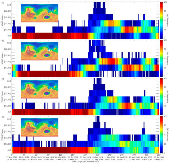 Figure 6. Statistical predictions of the dust storm activity level at five zones in the low-latitude regions of Mars. (a) Utopia Planitia, (b) Isidis Basin, (c) Amazonis Planitia, and (d) Chryse Planitia. Modified from He et al. [153]. The white rectangles represent the area of 3 × 3 grid used in the statistics.