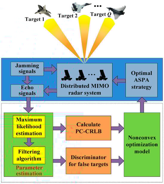 Under the background of electronic warfare (EW), the working environment of the radar system may be maliciously affected by electronic jammers, thus weakening its combat capability [1]. Generally speaking, when the self-defense jammer interferes with the main lobe of a single-station radar, its anti-interference ability is very limited due to the finite observation angle and single information source [2]. Owing to the “defocused transmit focused receive” (DTFR) working mode, the distributed multiple-input multiple-output (D-MIMO) radar is capable of transmitting wide beams to illuminate the surveillance area and synthesize the focused beams at the receiving end [3], which enhances spatial resolution and brings higher degrees of freedom [4]. Thus, the D-MIMO radar can combine the observation information of multiple channels to expand detection coverage and enhance parameter estimation capability, which shows great potential in the electronic counter-countermeasure (ECCM) [5,6]. However, when the D-MIMO radar performs the MTT task that the tracked targets carry with the self-defense jammer, due to its limited communication capability, the data processing speed of the fusion center, and the total transmit power budget [7,8], anti-jamming performance still needs to be guaranteed by an effective resource scheduling strategy.