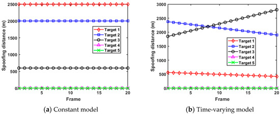 where represents the location of the qth target. Herein, is the radar cross-section (RCS) of the qth target, which is modeled as a complex parameter and satisfies . The term of represents the combination of the time delay from the real target and active deception jamming, which can be calculated as
