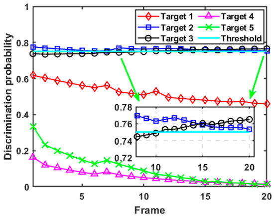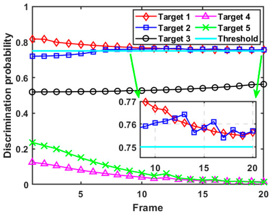 Figure 11 demonstrates the calculation results of the discrimination probability with respect to each target in case 2. It can be seen from Figure 11 that the variation trend of the discrimination probability for target 1 corresponds roughly to the trend in its spoofing distance parameters, and the results of discrimination probability are always below the preset threshold, suggesting that the radar resource budget is not enough to accurately identify all false targets. In addition, although the spoofing distance parameter of target 2 is always in a decreasing state, due to its large initial value, target 2 is always judged as a false target by the radar system after resource optimal scheduling. The discrimination probability of target 3 increases with the increase of its spoofing distance parameter and exceeds the discrimination threshold after the 11th frame. Similar to case 1, the results of the discrimination probability of target 4 and target 5 always remain at a low level and show a decreasing trend over time, which shows that the discrimination probability for the real target can be reduced with the improvement of its tracking accuracy at the same time. In summary, the calculation results of discrimination probability shown in Figure 11 conform to the change rule of the preset time-varying model of the spoofing distance parameter, which demonstrates the effectiveness and robustness of the formulated discriminator.